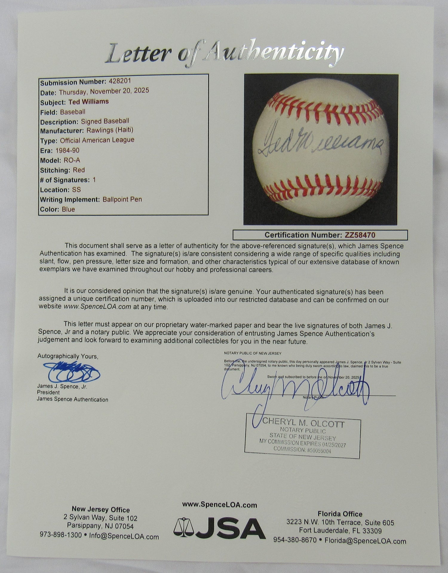 Celebrate one of baseball’s all-time greats with this stunning Ted Williams Signed Auto Rawlings Baseball, authenticated by JSA with Letter of Authenticity (LOA ZZ58470). As a Boston Red Sox legend and one of the most iconic hitters in Major League Baseball history, Ted Williams’ signature is a must-have for serious collectors and longtime fans. Ted, also known as "The Splendid Splinter," had an illustrious career, finishing with a .344 batting average and two MVP awards while serving in World War II and the Korean War in between seasons—making this autographed baseball not just a piece of sports memorabilia, but a tangible piece of American history. This Rawlings baseball boasts a clear and crisp autograph from Williams, making it a cherished centerpiece for any Red Sox or Hall of Fame collection.