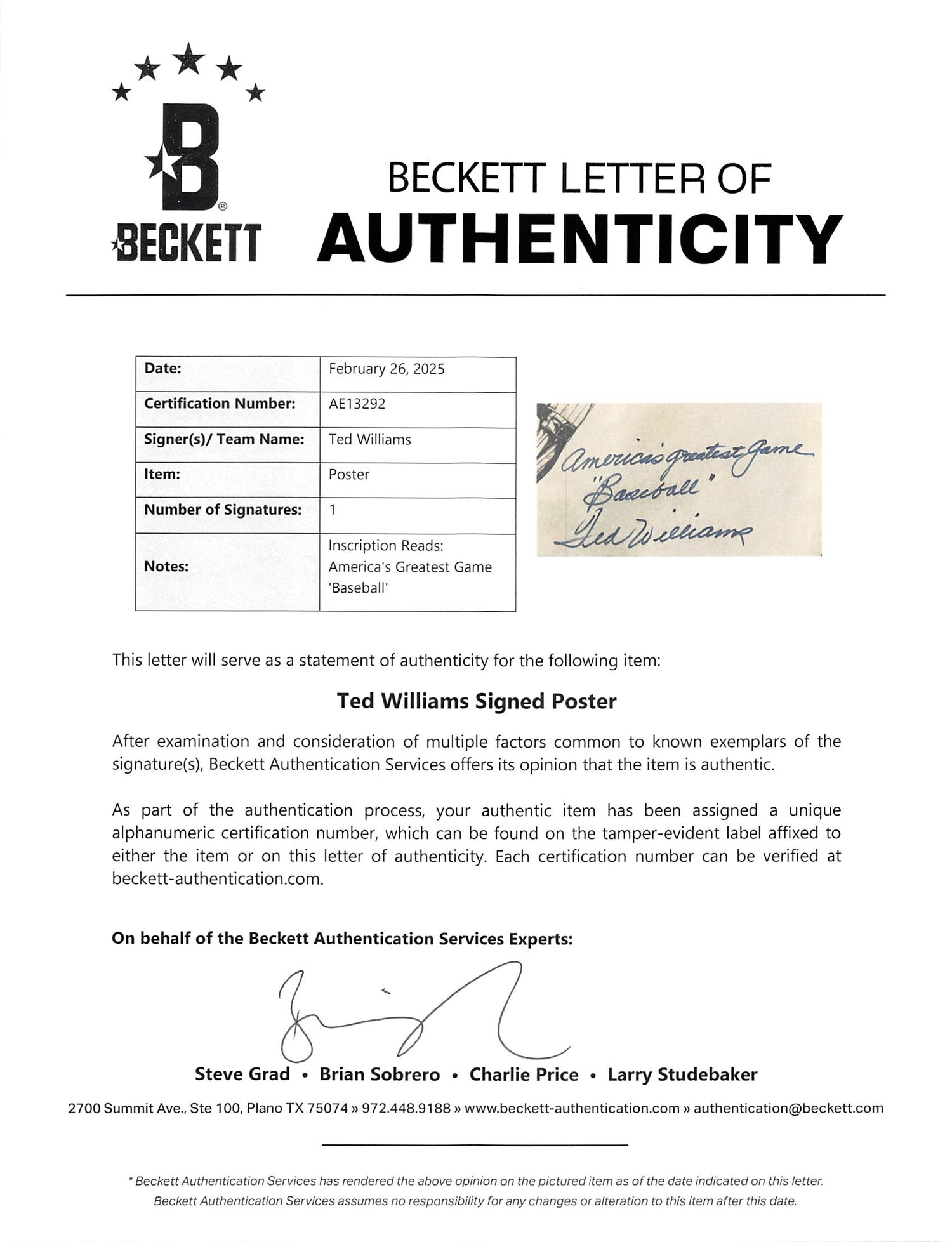 Ted Williams "America's Greatest Game" Signed 17.5x22 Lithograph BAS #AE13292 is backordered and will ship as soon as it is back in stock.