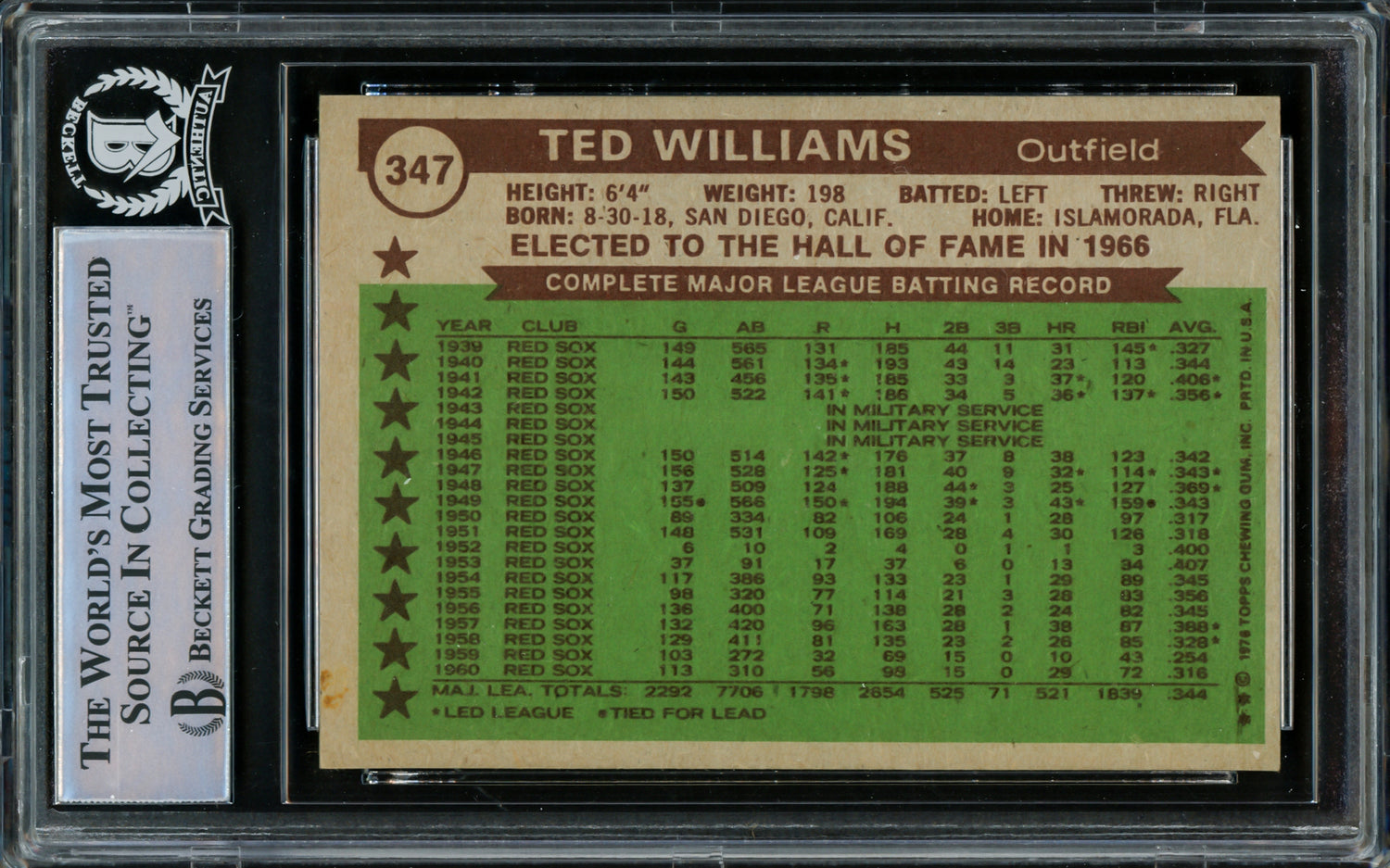- Official 1976 Topps Card #347 featuring Ted Williams