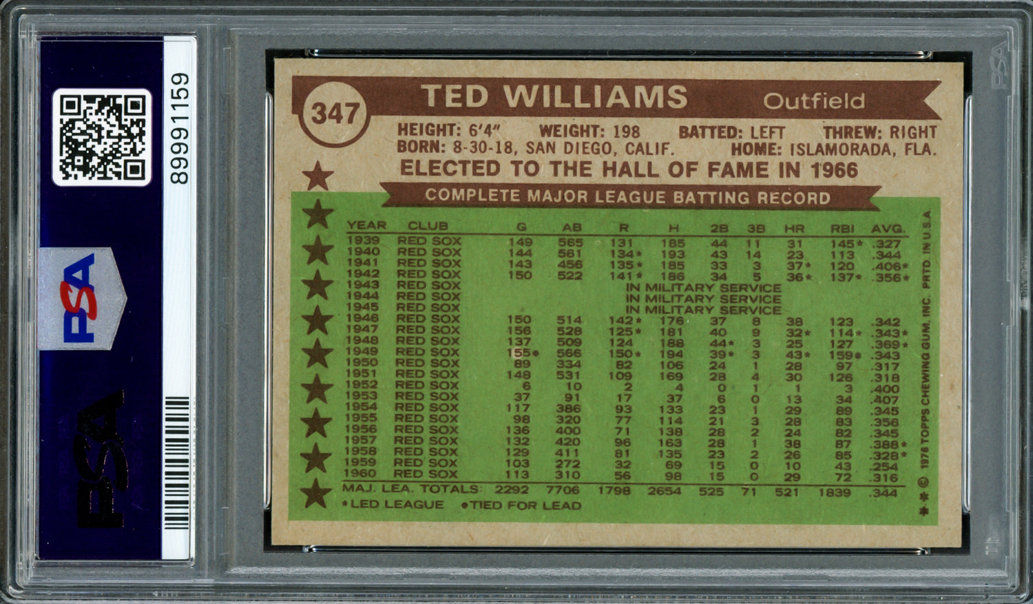 Own a piece of baseball history with this 1976 Topps Card #347, hand-signed by the legendary Ted Williams. A true collector's item, this vintage card has been professionally authenticated and graded for both its condition and signature quality.