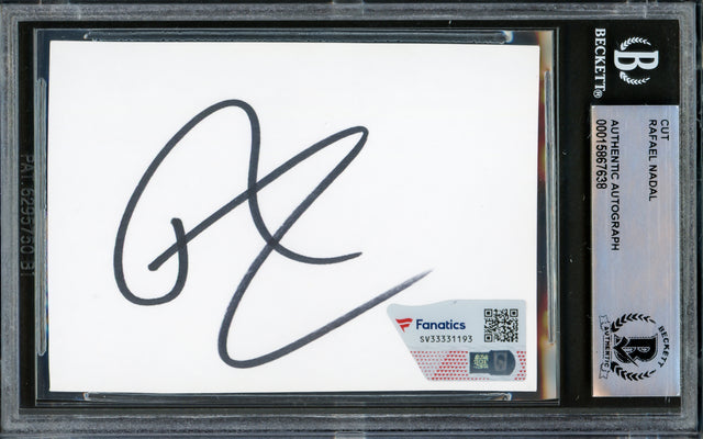 Own a piece of tennis history with this exceptional 2.5x3.5 Cut Signature hand-signed by Rafael Nadal, one of the greatest players ever to grace the court. This rare collectible has been authenticated and encapsulated by Beckett Authentication Services (BAS), ensuring its authenticity and long-term preservation in a tamper-proof holder. Whether you're a longtime fan of Nadal’s legendary Grand Slam victories or a dedicated sports memorabilia collector, this signed cut is a true centerpiece.
