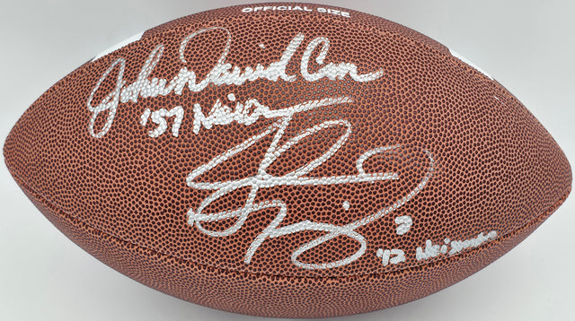 Capture a piece of college football history with this Official NCAA Wilson Leather Football, personally signed by two Texas A&M legends: John David Crow and Johnny Manziel. Both Heisman Trophy winners etched their legacies into NCAA history, and this exclusive memorabilia honors that remarkable achievement with the inscription "Heisman" included on the ball. Whether you're a die-hard Aggies fan or a collector of iconic college football memorabilia, this dual-signed football is a timeless treasure that bridges the generational greatness of two electrifying players. Authenticated by Beckett Authentication Services (BAS), it comes complete with a tamper-proof QR Code hologram for peace of mind and long-term value.