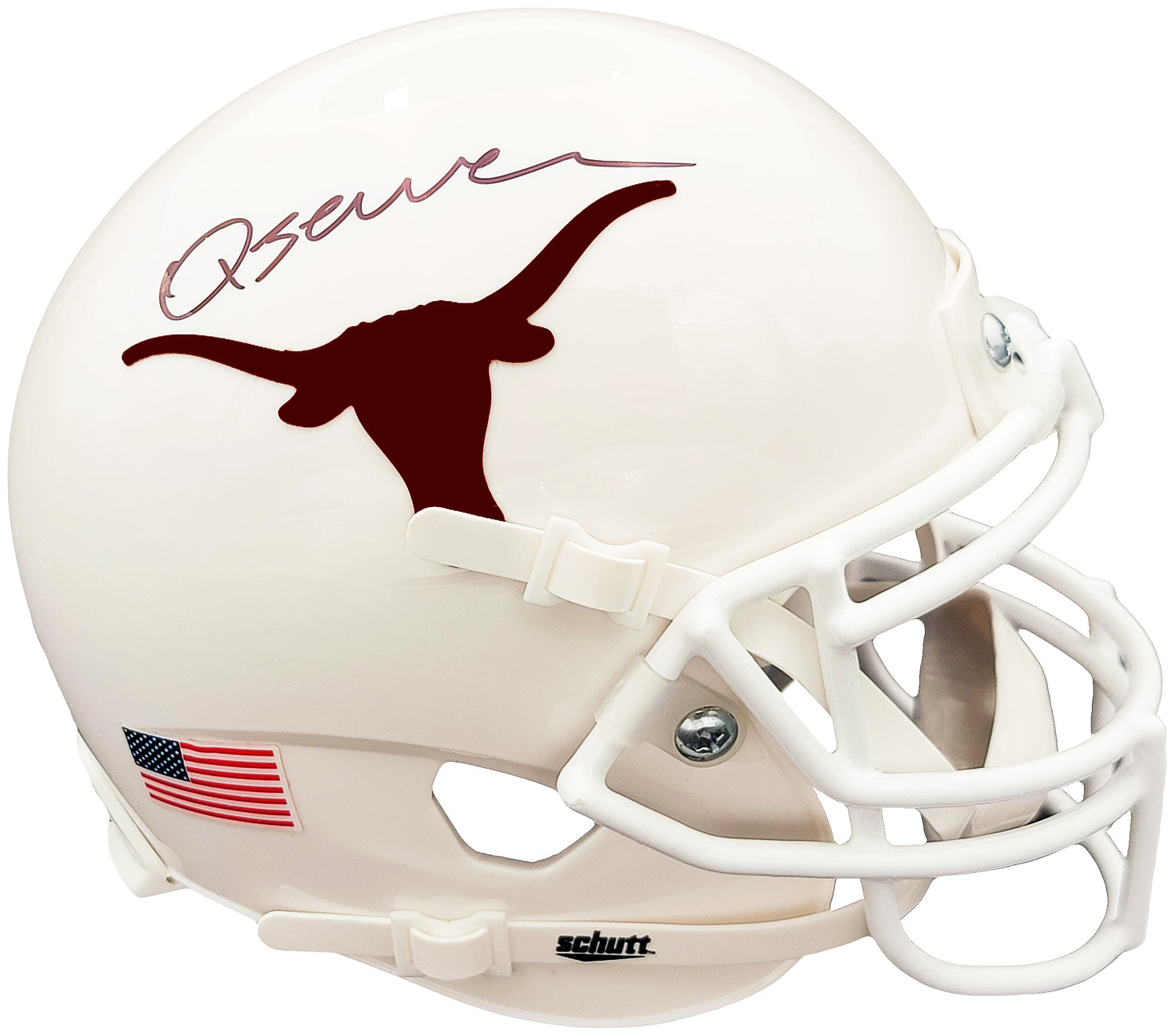 - Official Schutt mini helmet in classic Longhorns white design.