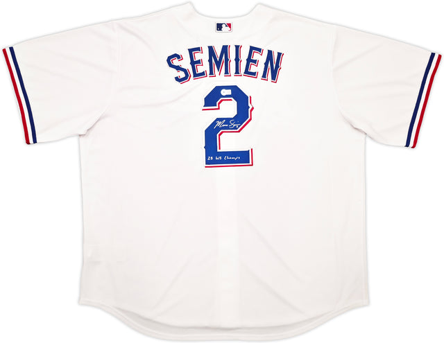 Celebrate the Texas Rangers' unforgettable 2023 World Series victory with this white Nike Texas Rangers jersey hand signed by Marcus Semien. A must-have for serious MLB collectors and Rangers fans alike, this autographed XXL jersey commemorates a historic season and a legendary player’s contribution to baseball history. Inscribed with "23 WS Champs," this collectible captures the electrifying moment the Rangers secured their first-ever World Series title in 2023, with Semien playing a key role in the team's success.