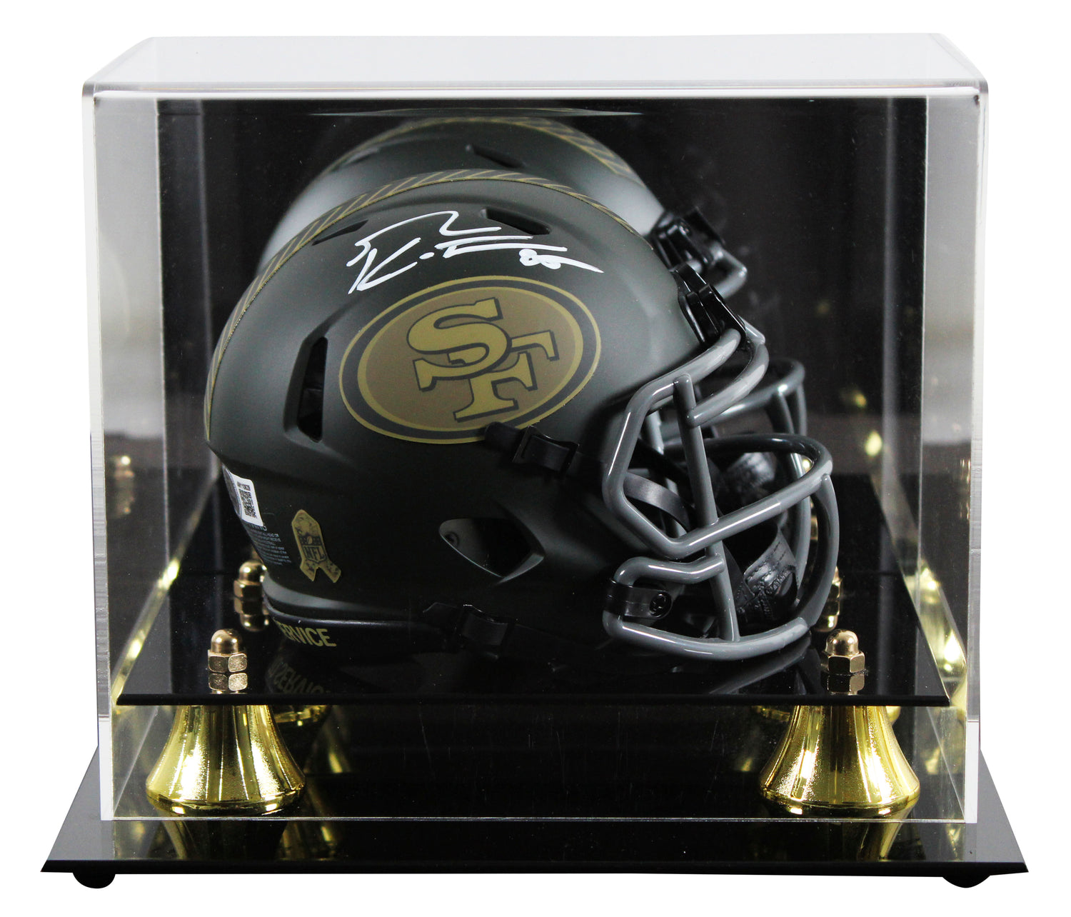 Celebrate your passion for the San Francisco 49ers with this George Kittle Autographed Alternate Salute To Service IV Speed Mini Helmet, proudly displayed in a UV mirrored back acrylic display case. This exclusive piece of NFL memorabilia is personally signed by George Kittle, star tight end for the 49ers and a fan-favorite known for his intensity, leadership, and playmaking ability. Each mini helmet is authenticated by Beckett Authentication Services (BAS), one of the most trusted names in sports memorabilia verification. This item is part of the BAS Witnessed Protection Program, ensuring a Beckett representative was present at the time of the signing. Whether you're a die-hard 49ers supporter, a George Kittle superfan, or a serious collector of signed NFL memorabilia, this helmet is an iconic piece that brings value, display appeal, and authenticity to your collection.
