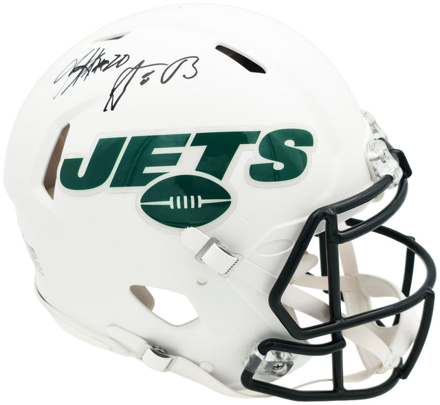 Show off your New York Jets pride with this stunning collector's piece — a Flat Matte White Full Size Speed Authentic Helmet hand signed by both Aaron Rodgers and Breece Hall. This exquisite item is a must-have for loyal Jets fans and serious memorabilia collectors, offering a rare dual-signature combination that celebrates two major talents in today’s NFL. Whether displayed in your fan cave or added to your investment-grade collection, this authentic signed helmet is the ultimate symbol of Jets devotion.