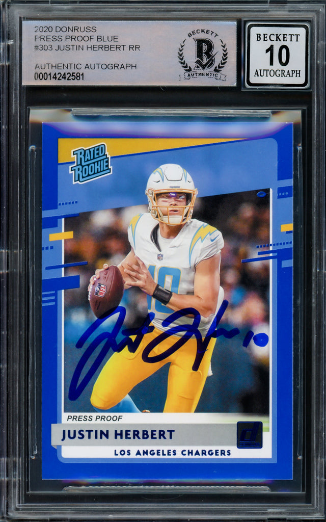 Justin Herbert Autographed 2020 Donruss Rated Rookie Blue Press Proof Rookie Card #303 Los Angeles Chargers Auto Grade Gem Mint 10 Beckett BAS #14242581