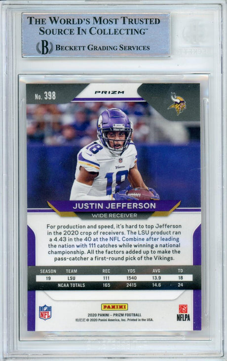 Very low stock (1 unit)$1,079Unit price /Unavailable2020 Panini Prizm Red, White & Blue #398 Justin Jefferson RC Vikings BGS Auto 10