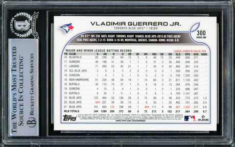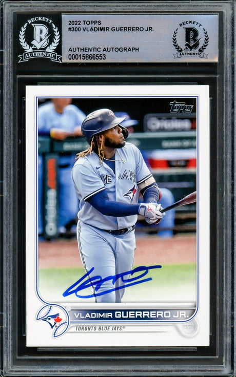 Very low stock (1 unit)$339Unit price /UnavailableVladimir Guerrero Jr. Autographed 2022 Topps Card #300 Toronto Blue Jays Beckett BAS Stock #219387