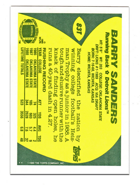 Barry Sanders Signed Detroit Lions 1989 Topps Football Rookie Trading Card #83T