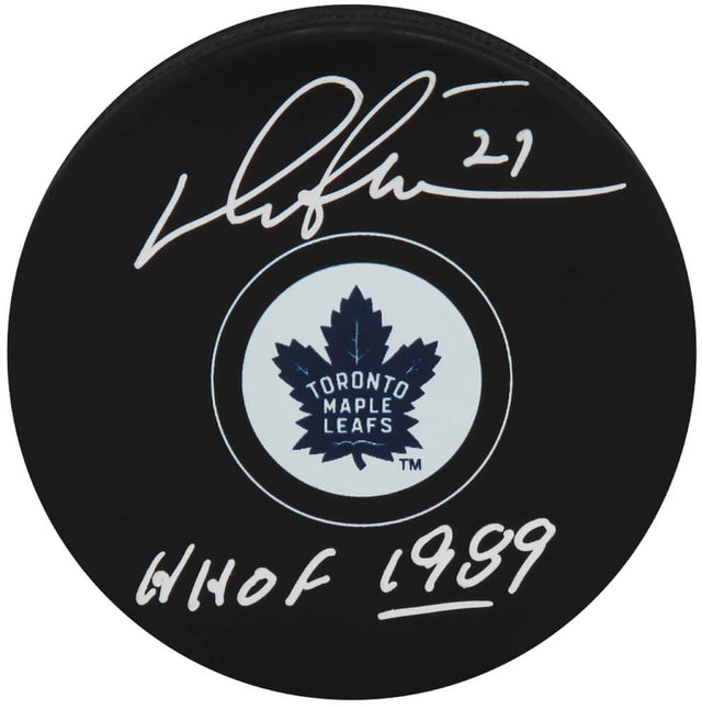 Own a piece of Toronto Maple Leafs history with this Darryl Sittler signed hockey puck, featuring the iconic Maple Leafs logo and a special "HHOF 1989" inscription honoring his induction into the Hockey Hall of Fame. A must-have for dedicated Leafs fans and collectors, this autographed puck celebrates one of the greatest players in franchise history.