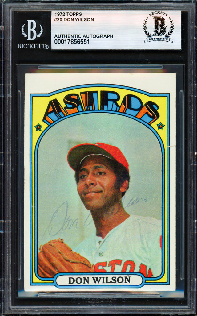 Own a piece of baseball history with this 1972 Topps Card #20 signed by Don Wilson, a standout pitcher for the Houston Astros during the late 1960s and early 1970s. This vintage trading card is more than just a collectible — it's a tribute to a talented athlete whose promising career left a lasting mark on the game. Authenticated by Beckett Authentication Services (BAS) and housed in their tamper-proof holder, this card offers rock-solid provenance and display-ready protection for collectors and fans alike.