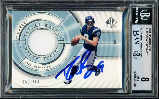 Drew Brees Autographed 2001 Upper Deck SP Authentic Rookie Card #101 San Diego Chargers BGS 8 Auto Grade Gem Mint 10 Jersey Patch #159/800 Beckett BAS #15681983