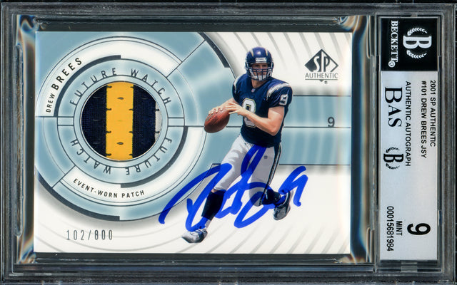 Drew Brees Autographed 2001 Upper Deck SP Authentic Rookie Card #101 San Diego Chargers BGS 9 Auto Grade Gem Mint 10 Jersey Patch #102/800 Beckett BAS #15681984