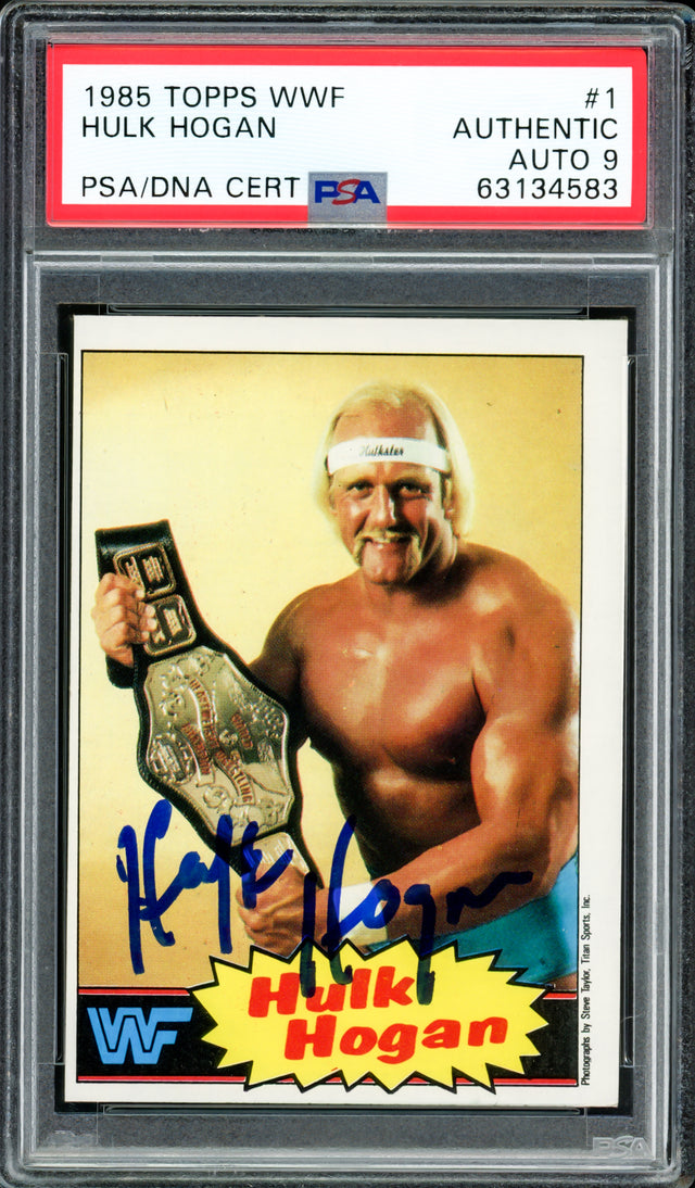 Hulk Hogan Autographed 1985 Topps WWF Yellow Rookie Card #1 Auto Grade Mint 9 PSA/DNA #63134583