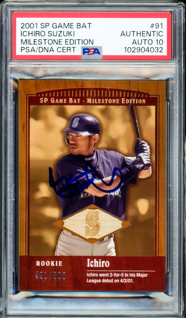 Ichiro Suzuki Autographed 2001 SP Game Bat Rookie Card #91 Seattle Mariners Auto Grade Gem Mint 10 Milestone Edition #491/500 PSA/DNA #102904032