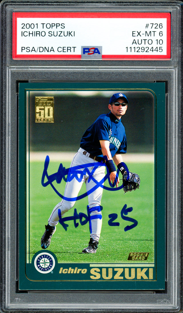 Ichiro Suzuki Autographed 2001 Topps Rookie Card #726 Seattle Mariners PSA 6 Auto Grade Gem Mint 10 "HOF 25" PSA/DNA #111292445