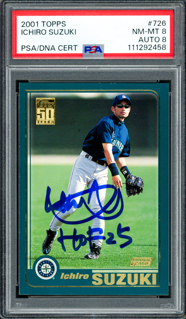 Ichiro Suzuki Autographed 2001 Topps Rookie Card #726 Seattle Mariners PSA 8 Auto Grade Near Mint/Mint 8 "HOF 25" PSA/DNA #111292458
