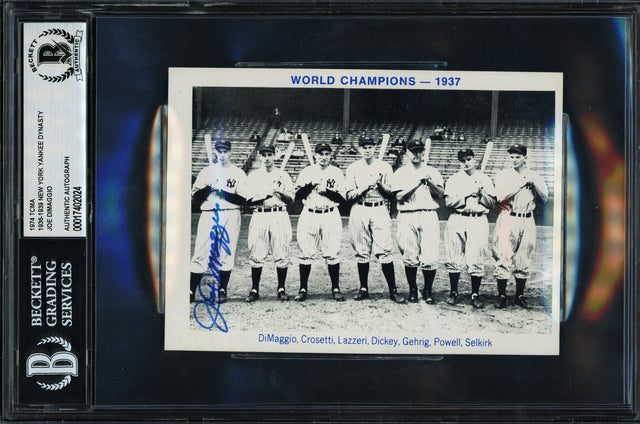 Own a remarkable piece of baseball history with this iconic 1974 36-'39 Yankee Dynasty TCMA Card, approximately 4x5.5 inches, hand signed by legendary New York Yankees outfielder Joe DiMaggio. A stunning collectable from the golden age of the Yankees, this card commemorates the team's dominant 1936–1939 era—a defining stretch that cemented their legacy as one of the greatest dynasties in Major League Baseball. DiMaggio’s signature adds timeless value for any serious collector or Yankees fan, capturing the spirit of a sports icon who helped define an era. The autograph has been certified authentic by Beckett Authentication Services (BAS) and is encapsulated in their tamper-proof holder for long-term protection and display. Whether you’re enhancing your personal collection or searching for a unique gift for a baseball enthusiast, this certified Joe DiMaggio signed card offers unmatched historical and sentimental value.