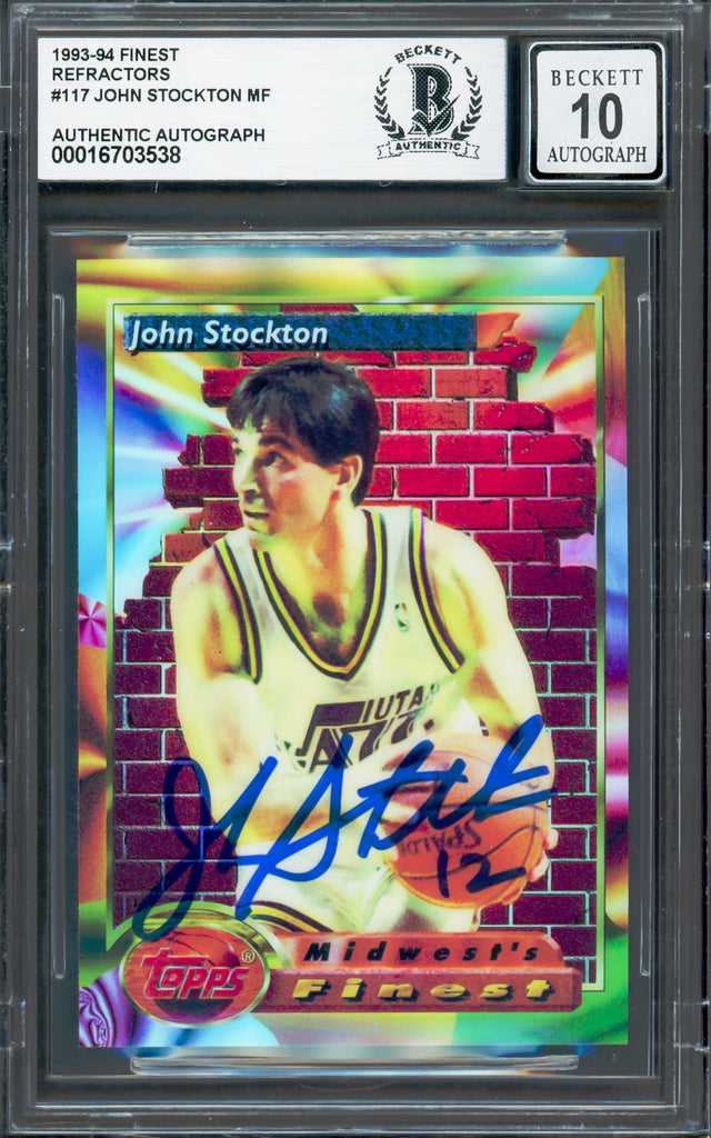John Stockton Autographed 1993-94 Topps Finest Refractor Card #117 Utah Jazz Auto Grade Gem Mint 10 Beckett BAS #16703538