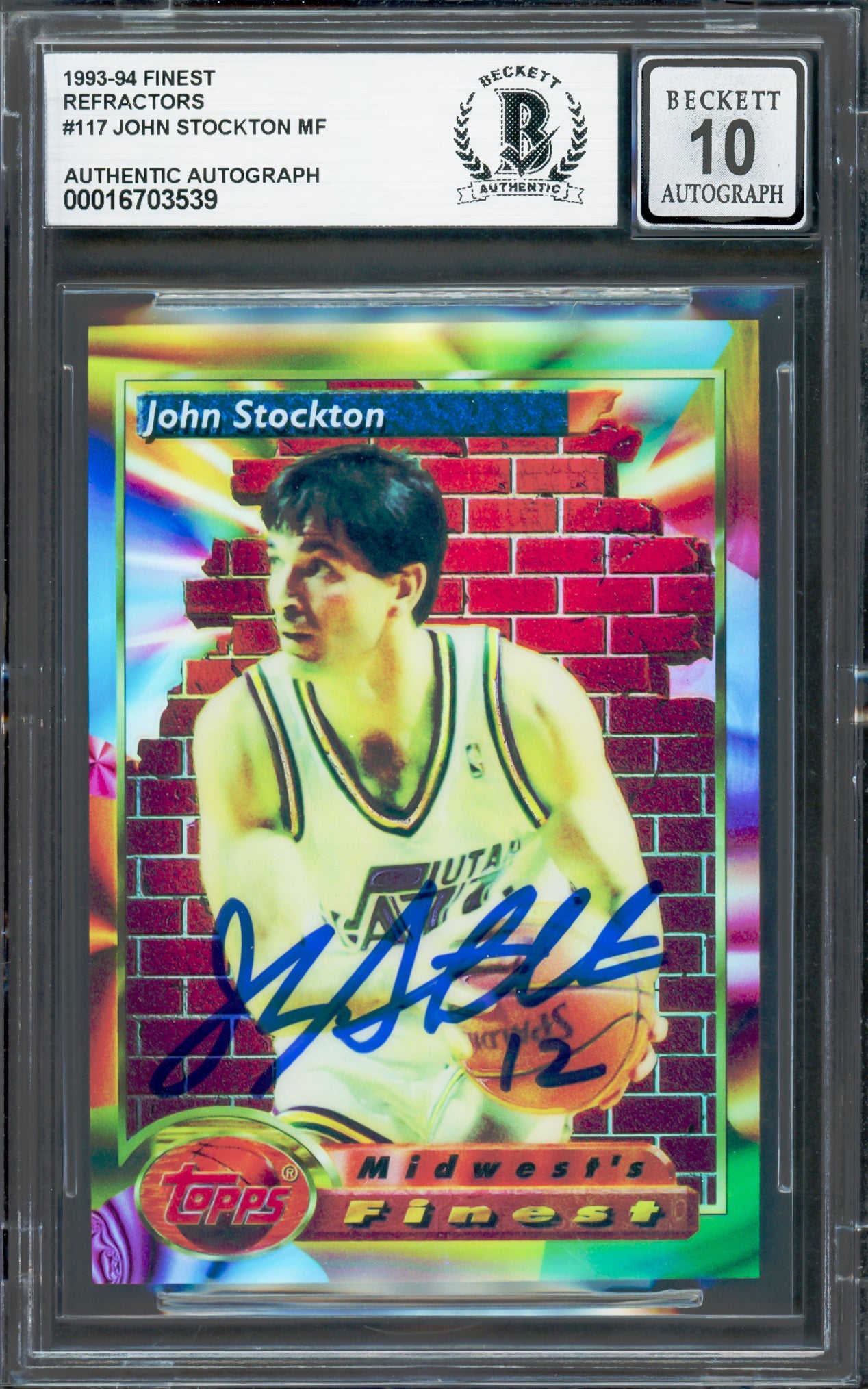 John Stockton Autographed 1993-94 Topps Finest Refractor Card #117 Utah Jazz Auto Grade Gem Mint 10 Beckett BAS #16703539
