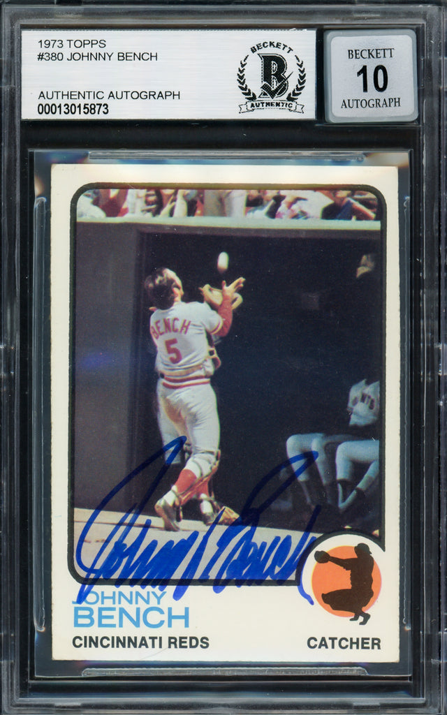 Johnny Bench Autographed 1973 Topps Card #380 Cincinnati Reds Auto Grade Gem Mint 10 Beckett BAS #13015873