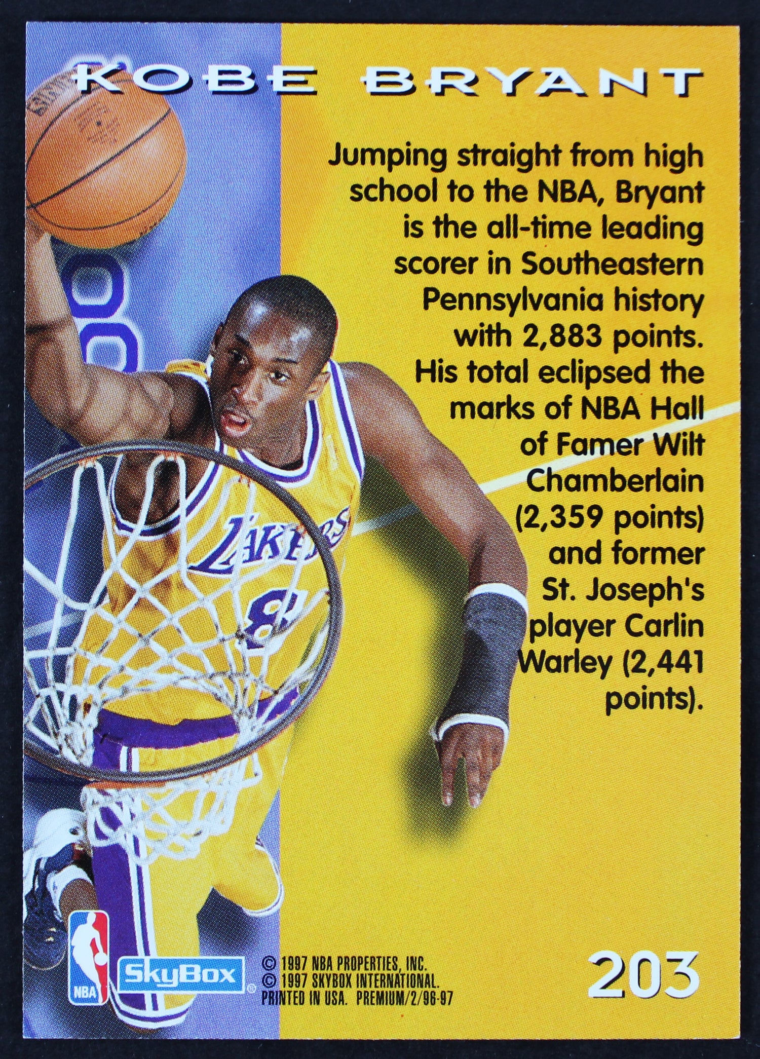 - 1996 Skybox Premium #203 Rookie Card – A coveted rookie card from the year Bryant entered the league, marking the start of an iconic career.