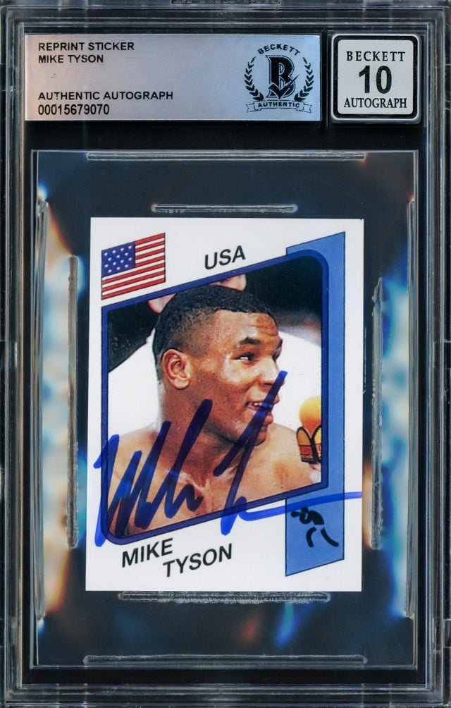 Mike Tyson Autographed 1986 Panini Supersport Reprint Rookie Retro Sticker Card #153 Auto Grade Gem Mint 10 Beckett BAS Stock #228824 is backordered and will ship as soon as it is back in stock.