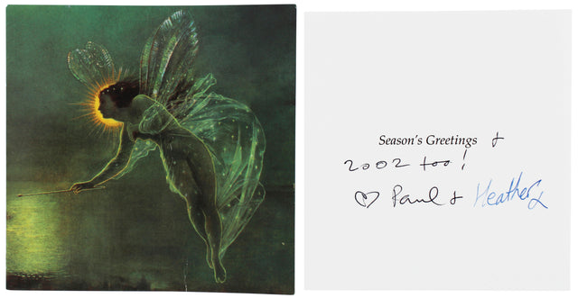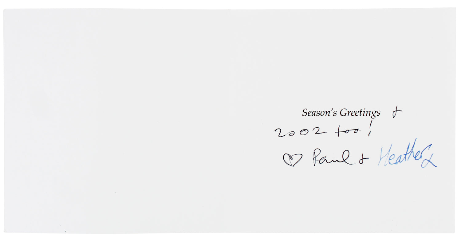 Own a rare piece of music and pop culture history with this Paul McCartney & Heather Mills Autographed Card, featuring the unique inscription "2002 too! (McCartney)." This extraordinary collectible is a must-have for Beatles fans and memorabilia enthusiasts alike.