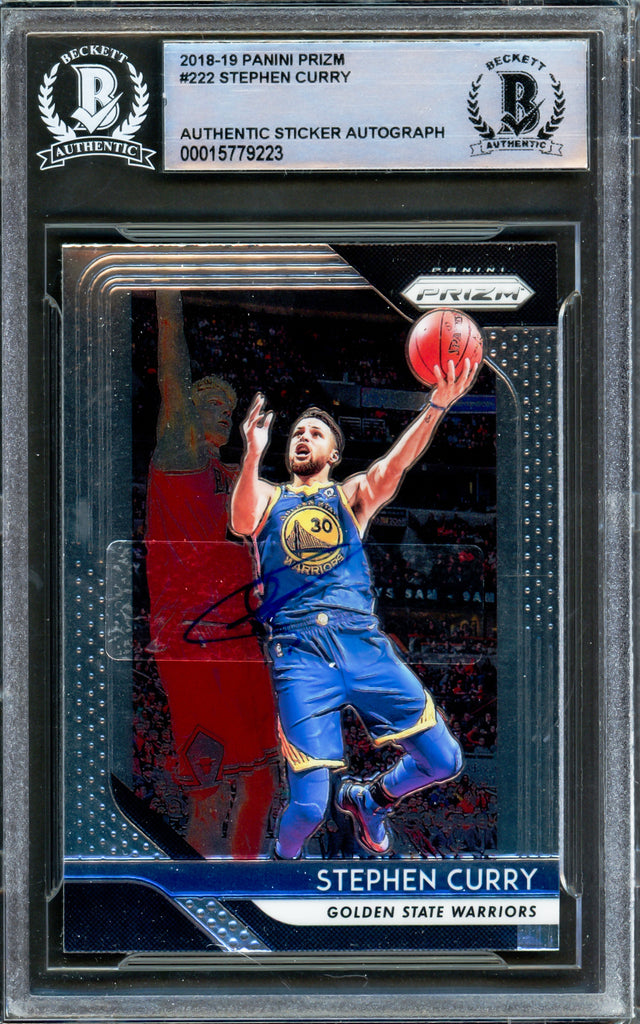 Own a piece of basketball history with this 2018-19 Panini Prizm Card #222, hand-signed by Stephen Curry—one of the greatest shooters in NBA history. This collectible card features Curry’s authenticated autograph on a sticker, securely placed on the card and certified by Beckett Authentication Services (BAS). Encapsulated in Beckett’s tamper-proof holder, this item is protected for long-term preservation, making it a must-have for any serious collector or Golden State Warriors fan.