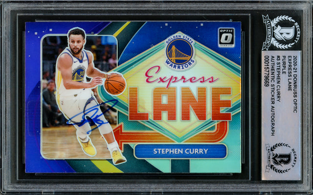 Stephen Curry Autographed 2020-21 Donruss Optic Purple Prizm Express Lane Card #3 Golden State Warriors Beckett BAS #15779669