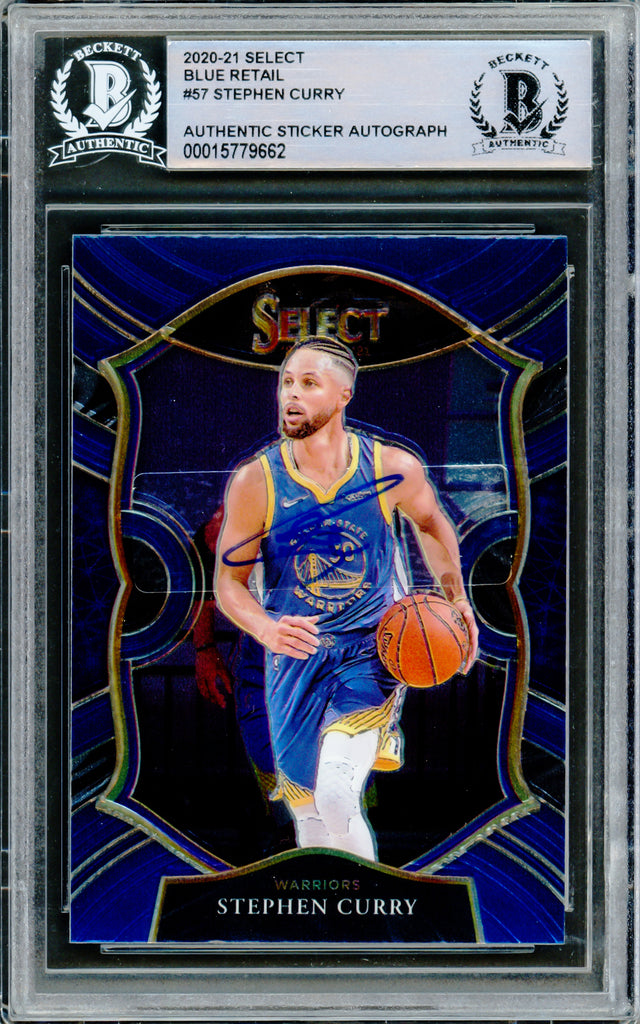 Stephen Curry Autographed 2020-21 Panini Select Blue Retail Card #57 Golden State Warriors Beckett BAS Stock #216859 is backordered and will ship as soon as it is back in stock.