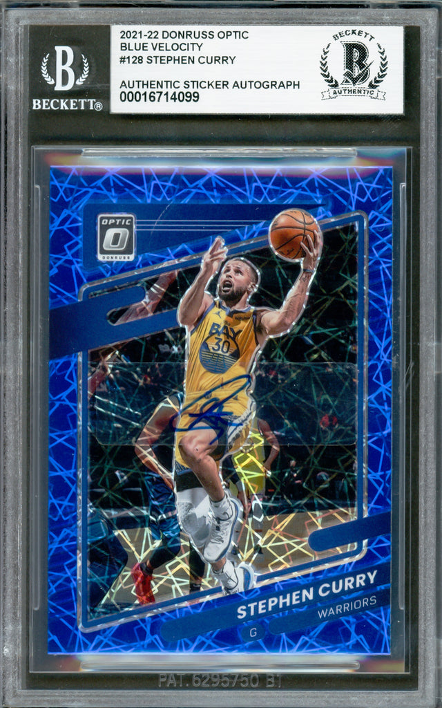 Own a piece of basketball history with this 2021-22 Donruss Optic Blue Velocity Prizm Card #128, hand-signed by NBA legend Stephen Curry. This highly sought-after collectible features an authentic autograph placed on a sticker and adhered to the card, making it a must-have for dedicated collectors and Golden State Warriors fans alike. Certified by Beckett Authentication Services (BAS) and encapsulated in their tamper-proof holder, this card is a verified and protected investment in basketball greatness.