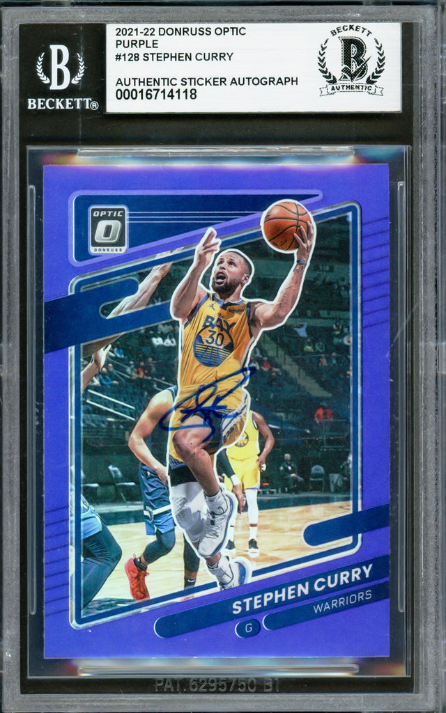 Stephen Curry Autographed 2021-22 Donruss Optic Purple Prizm Card #128 Golden State Warriors Beckett BAS #16714118