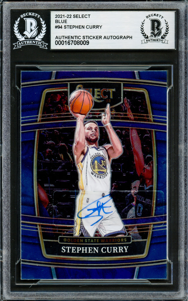 Stephen Curry Autographed 2021-22 Select Blue Card #94 Golden State Warriors Beckett BAS Stock #228007 is backordered and will ship as soon as it is back in stock.