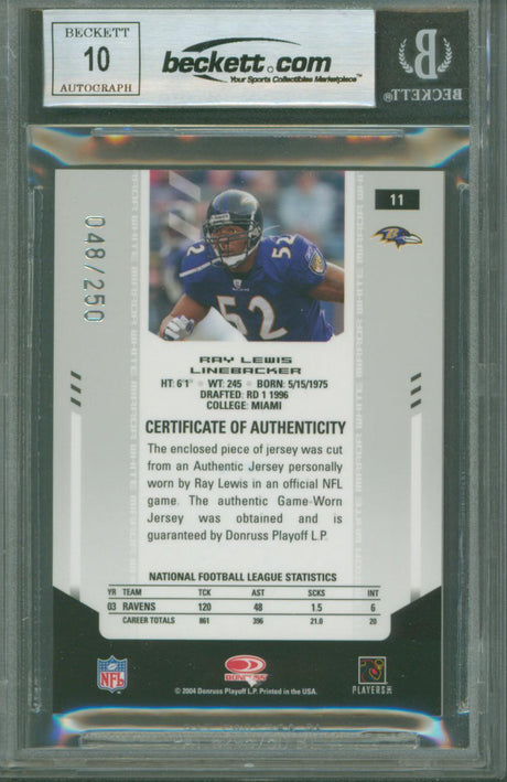 Ravens Ray Lewis Signed 2007 Donruss Threads Jerseys #6 Card Auto 10! BAS Slab