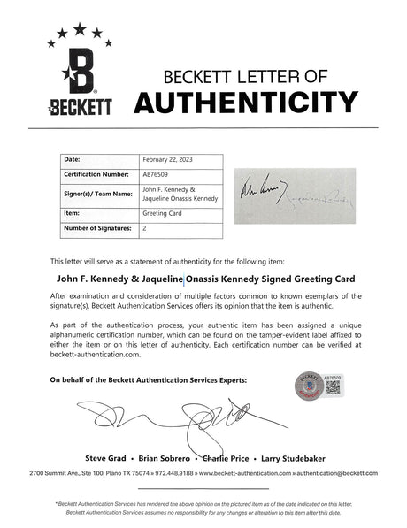 John F. Kennedy & Jaqueline Onassis Signed 1963 Unsent Christmas Card BAS LOA