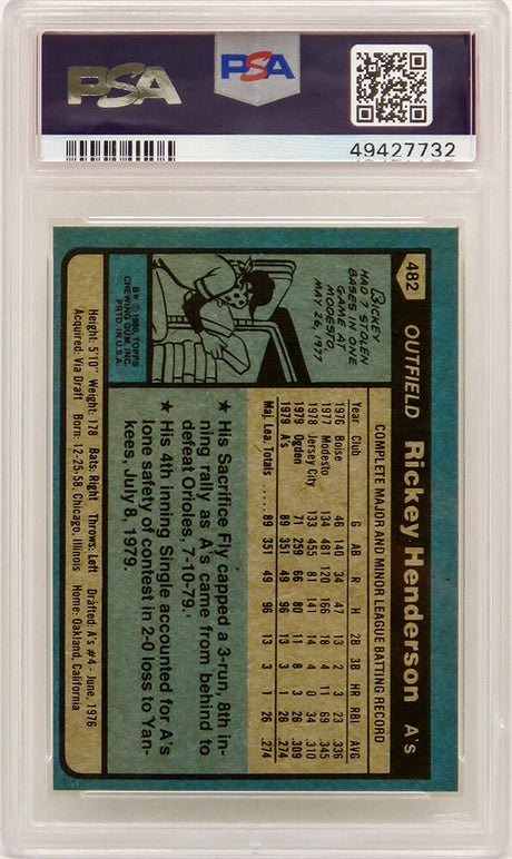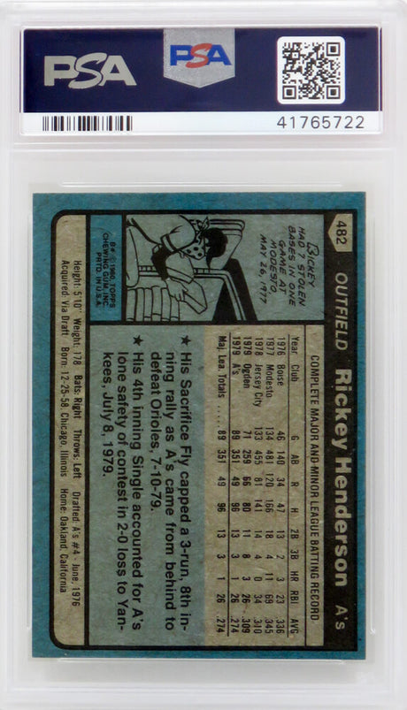 Rickey Henderson (Oakland A's) 1980 Topps Baseball #482 RC Rookie Card - PSA 8 NM-MT (G)