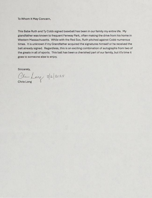 - Hand signed by Babe Ruth and Ty Cobb — two of baseball’s most iconic Hall of Famers