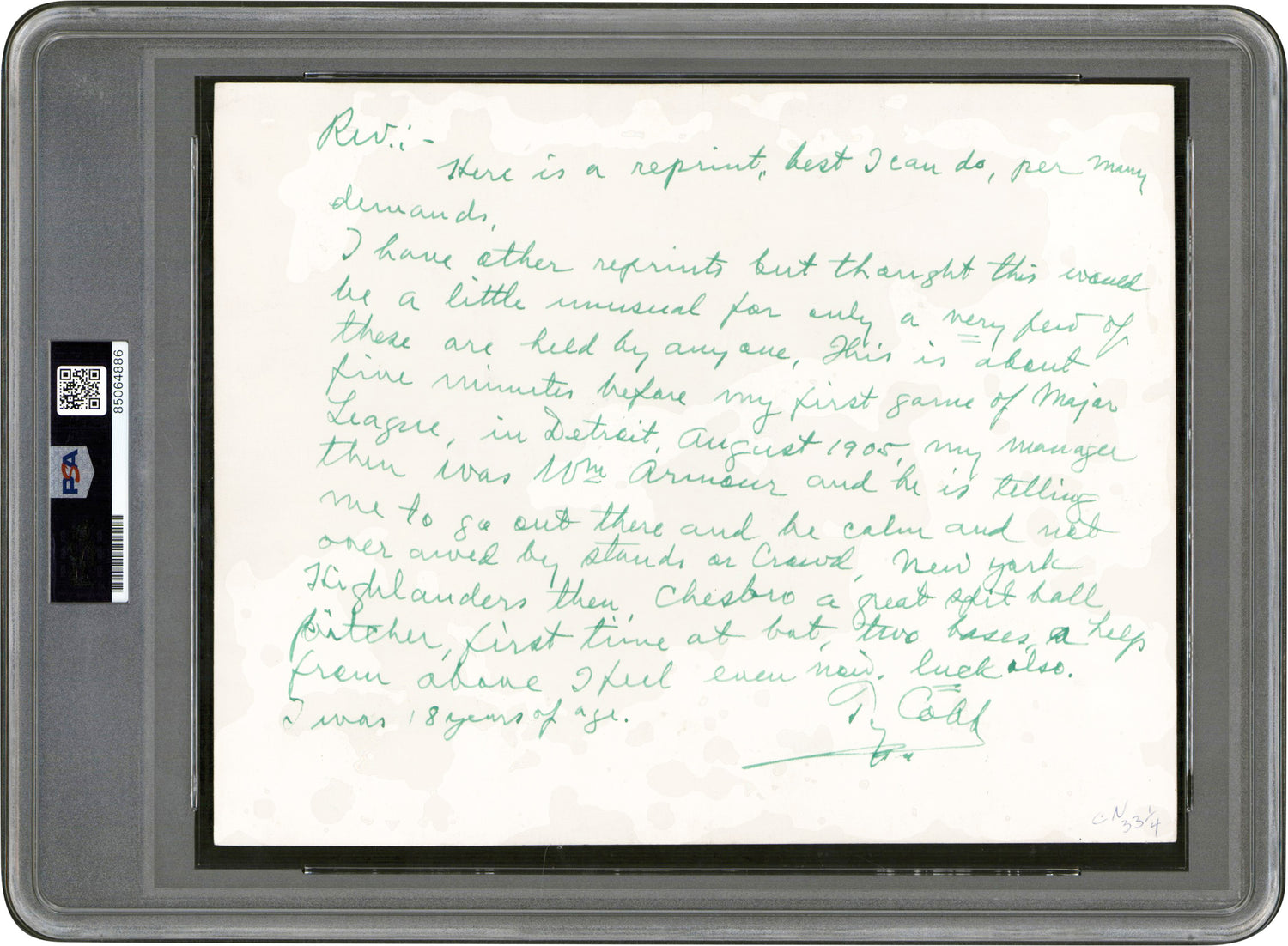 - Unique Personal Connection – Includes a Cobb-signed note on the back, addressed to Reverend Gerdau, providing rare insight into his feelings before his first Major League game against the New York Highlanders.