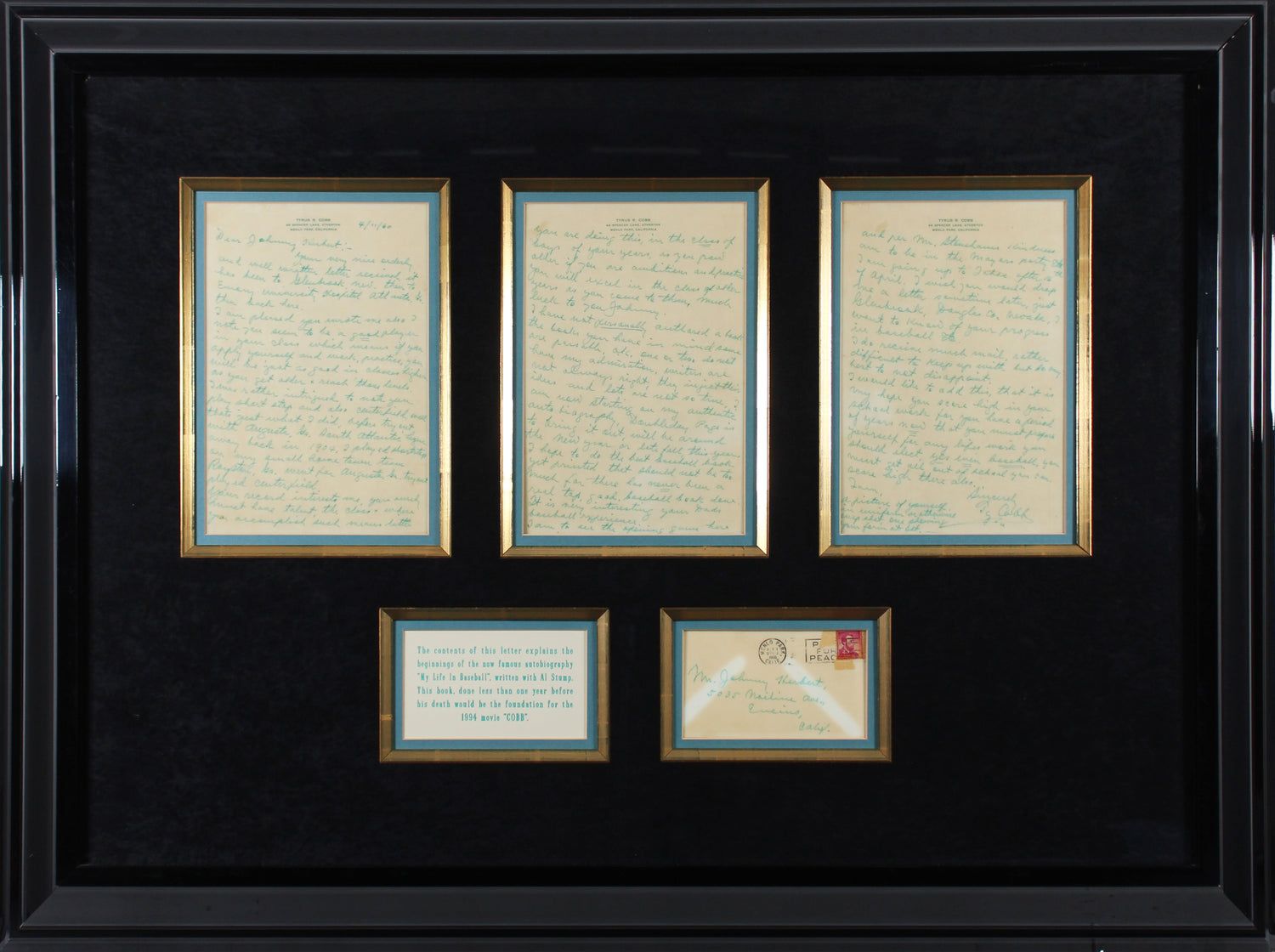 Own a remarkable piece of baseball history with this Ty Cobb Autographed & Dated April 11, 1960, Framed 3-Page Letter. Personally signed by the legendary Ty Cobb of the Detroit Tigers, this letter provides a rare glimpse into the mind of one of baseball’s greatest players. Authenticated by JSA (James Spence Authentication) with a Certificate of Authenticity (COA) and tamper-proof hologram, this collectible is guaranteed to be 100% genuine. This professionally framed piece measures approximately 30 x 40 inches, making it a stunning display for any collector’s home, office, or memorabilia gallery. The letter, addressed to a young baseball fan, reveals Cobb’s ambition to write what he intended to be "the best baseball book yet printed"—which would later become "My Life in Baseball: A True Record", published in 1961 shortly after his passing. ### Key Features: