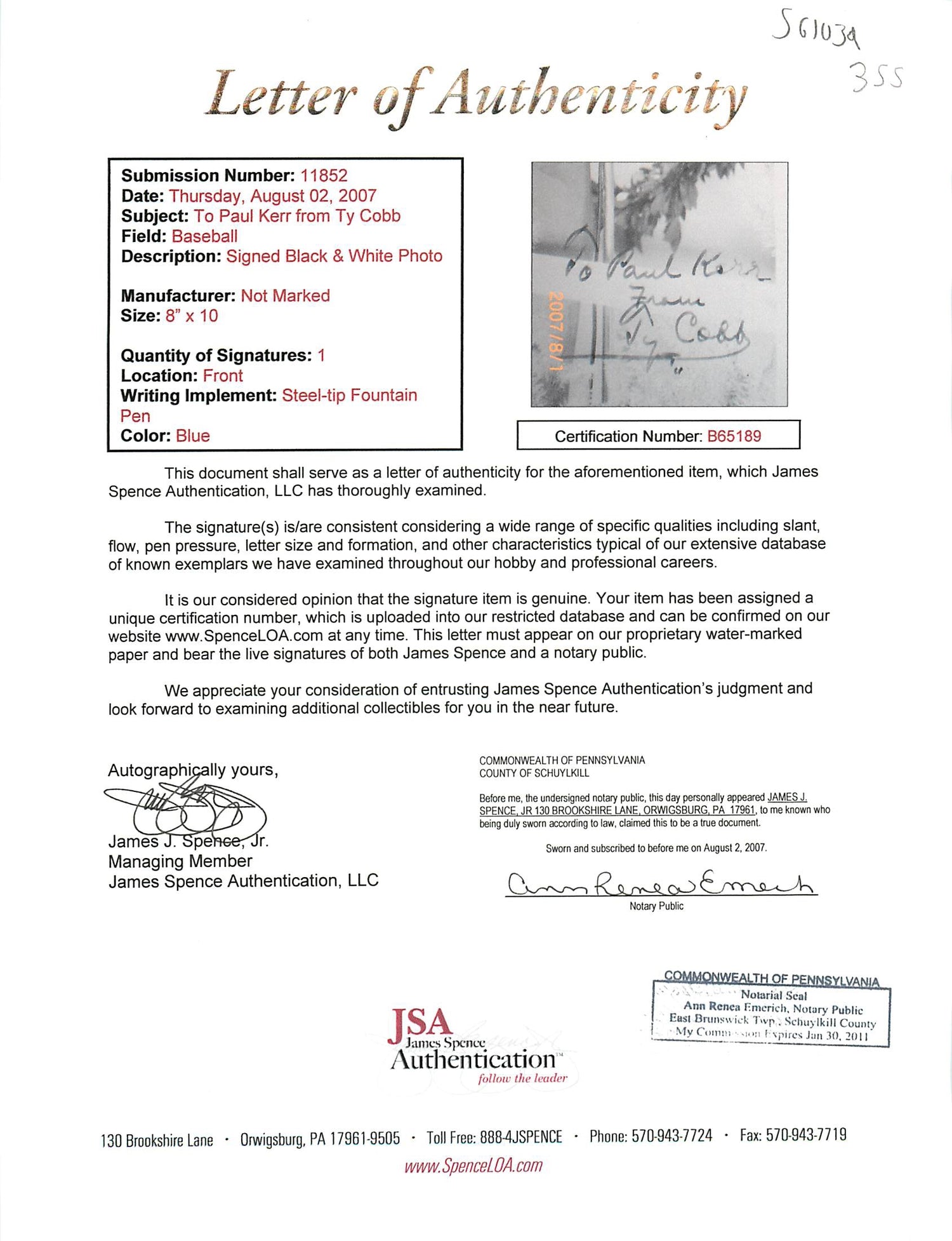 - Authentic Ty Cobb Signature – Personally signed and inscribed to Paul Kerr.