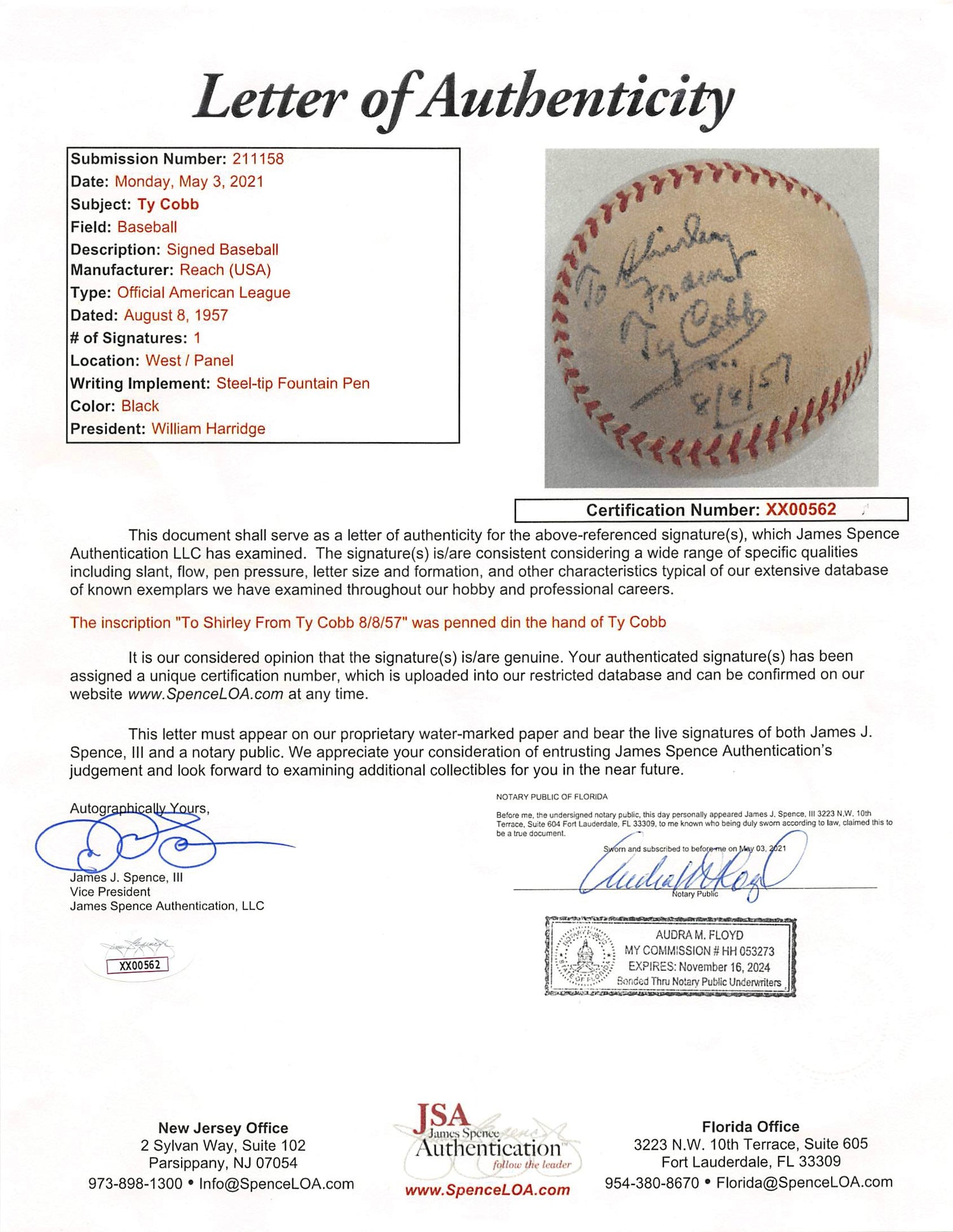 Own a rare piece of baseball history with this Ty Cobb Autographed William Harridge OAL Baseball, inscribed "To Shirley From 8/8/57." This extraordinary collectible is a must-have for serious memorabilia collectors and Detroit Tigers fans alike.