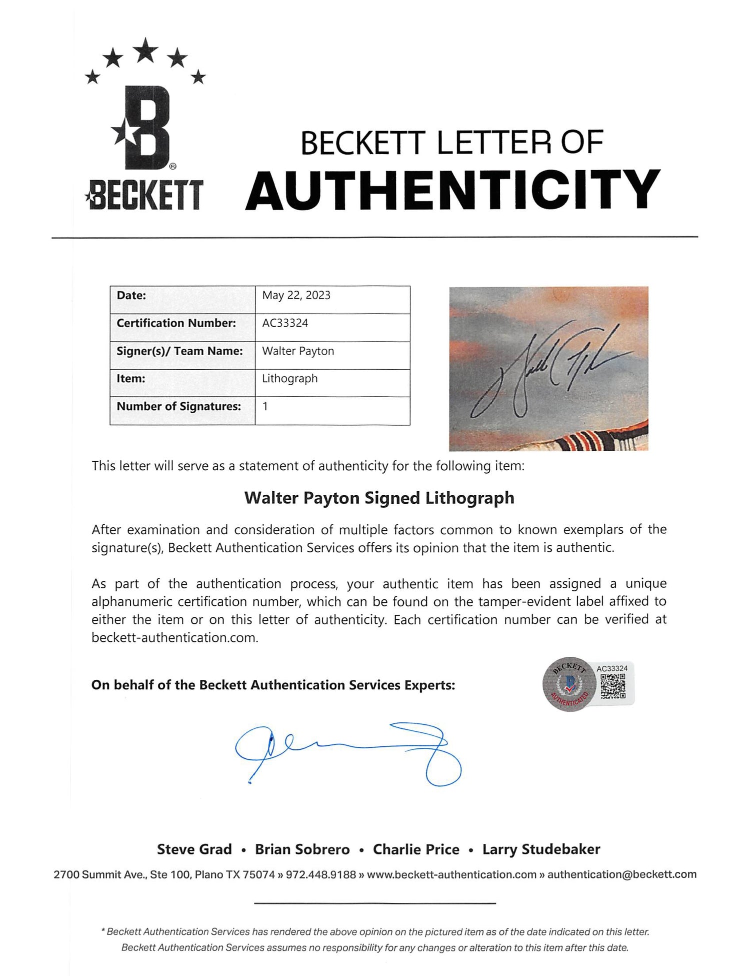 Own a piece of football history with this Autographed Limited Edition #1438/1993 & Framed 20x30 Lithograph, personally signed by legendary Walter Payton of the Chicago Bears. Known as "Sweetness," Payton was one of the most electrifying running backs in NFL history, leaving an enduring legacy with his record-breaking performances and contributions to the game. This memorabilia is 100% authentic, verified by Beckett Authentication Services (BAS), and includes a Certificate of Authenticity (COA) and hologram. You can verify the authenticity directly on the Beckett website. Professionally framed, this stunning lithograph measures approximately 30.5 x 39.5 inches, making it a standout centerpiece for any sports collection, man cave, or office. Key Features: