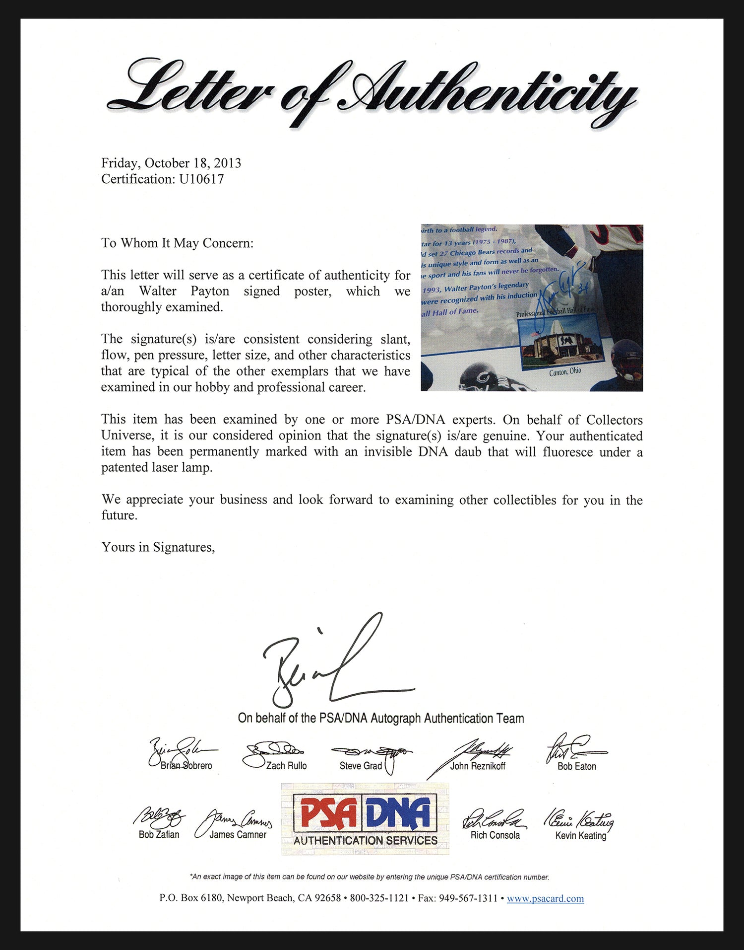 - Authentic signature of NFL icon Walter Payton