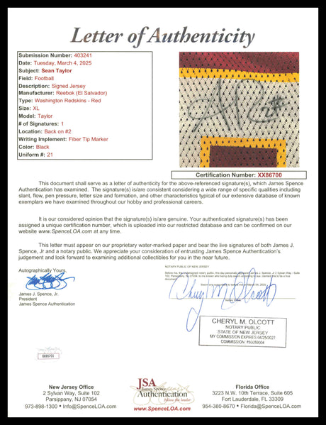 Washington Redskins Sean Taylor Autographed Framed Maroon Reebok Jersey JSA #XX86700