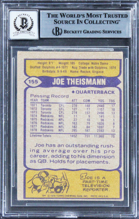 Very low stock (1 unit)$329Unit price /Unavailable Commanders Joe Theismann Signed 1979 Topps #155 Card Auto Graded 10! BAS Slabbed