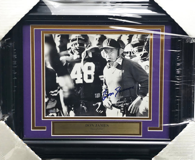 Own a piece of college football history honoring the coach who helped define a championship era at Washington. This framed Don James signed photo is a standout collectible, ideal for display in your home, office, or fan cave.