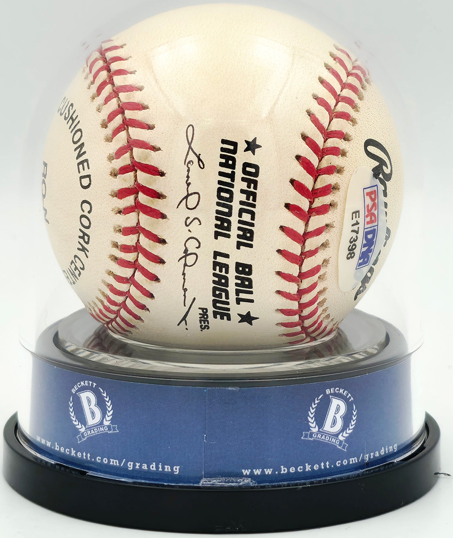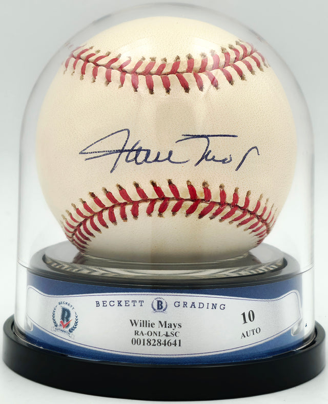 This is a must-have collectible for any baseball enthusiast or memorabilia collector — an Official National League Baseball hand signed by legendary Hall of Famer Willie Mays. Known as “The Say Hey Kid,” Mays is widely considered one of the greatest all-around players in MLB history, with 660 career home runs, 24 All-Star appearances, and a storied legacy with the New York and San Francisco Giants. This iconic piece of baseball history isn’t just signed — the signature is graded a perfect Gem Mint 10 by Beckett Authentication Services (BAS), making it a true investment-grade collectible.