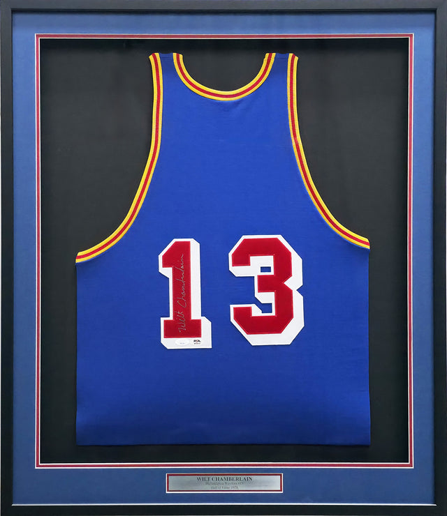 Celebrate basketball greatness with this rare and iconic collectible: a Framed Blue 1961-62 Mitchell & Ness Philadelphia Warriors Jersey, hand signed by NBA legend Wilt Chamberlain. Measuring approximately 31x36 inches including the professional-grade frame, this striking piece commemorates the Philadelphia Warriors' final season before relocating, and one of the most dominant periods in Chamberlain's career — a season that famously included his historic 100-point game. This item is a must-have for serious collectors of vintage NBA memorabilia and fans of Wilt "The Stilt."